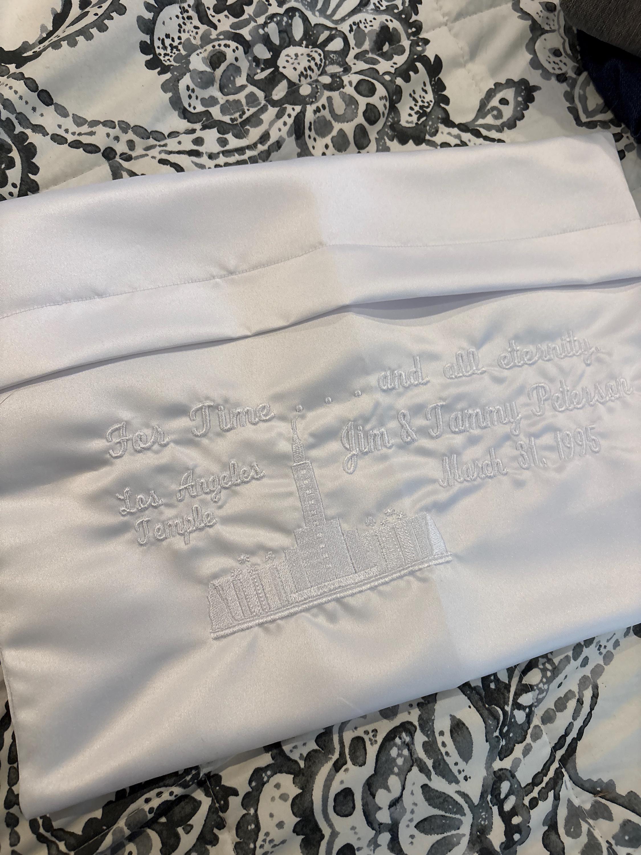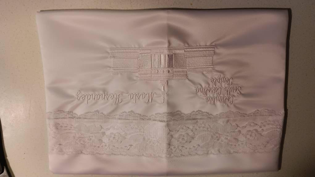 If you don't find the temple you need, please message us for more information.Beautifully embroidered LDS Temple envelope comes with temple and title of the temple and can be personalized by adding a name and/or date. Please note that pictures are for general layout ideas only. Each envelope is adjusted and will be laid out to fit the temple & personalization as needed.